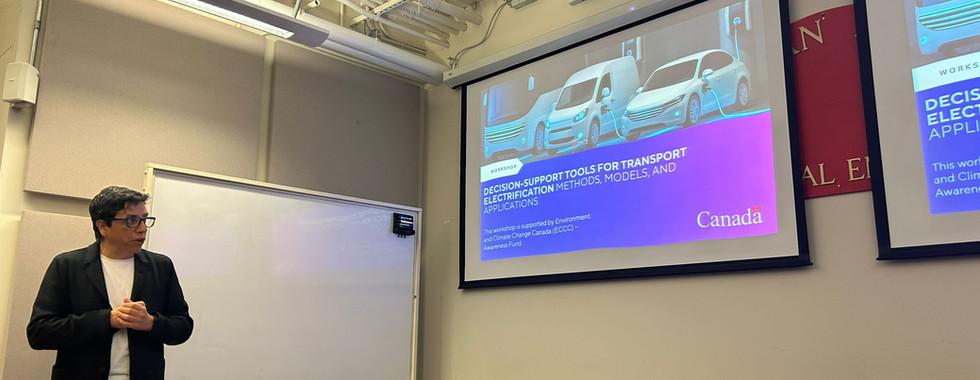 The workshop featured five research presentations showcasing diverse approaches to transport electrification. Jônatas Augusto Manzolli opened with a study on scenario-driven optimization for electric bus fleets in Quebec, linking climate impacts to smart charging strategies. Arsham Bakhtiari followed with an agent-based analysis of electric vehicle charging behavior under dynamic pricing, exploring temporal and spatial patterns. Ashraf Uz Zaman Patwary discussed a traffic- and activity-informed method for locating charging facilities. Kayhan Alamatsaz then presented optimization models for electric bus operation and charging station planning, emphasizing network efficiency. Finally, Ahad Farnood Ahmadi closed the session with a spatial accessibility study assessing walkable access to EV charging infrastructure for older adults in Montreal, highlighting equity considerations in urban electrification.